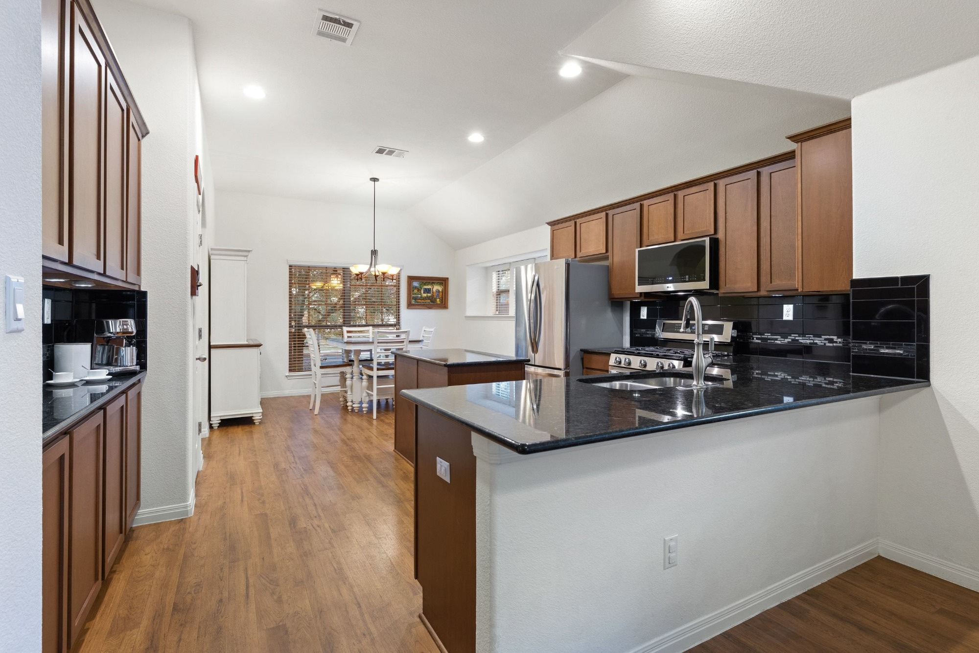 Inside, the open floor plan features a bright kitchen, dining, and living area highlighted by 10-foot vaulted ceilings and a charming window seat in the living room. The kitchen boasts granite countertops, a center island, stainless steel appliances—including refrigerator, gas range, microwave, and dishwasher—plus a built-in bar and pantry. A separate utility room accommodates full-size side-by-side laundry machines with vented exhaust fan for convenience.