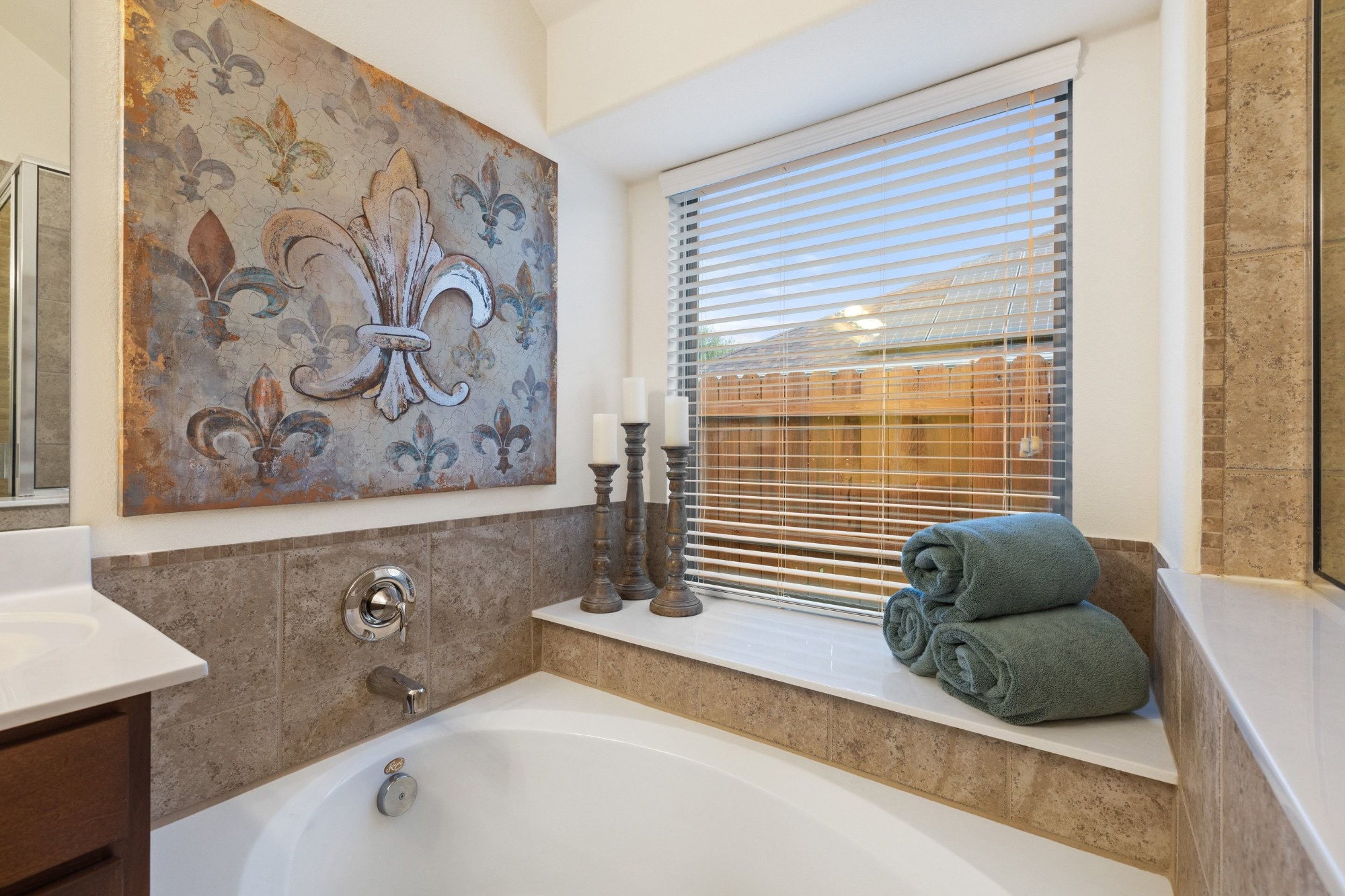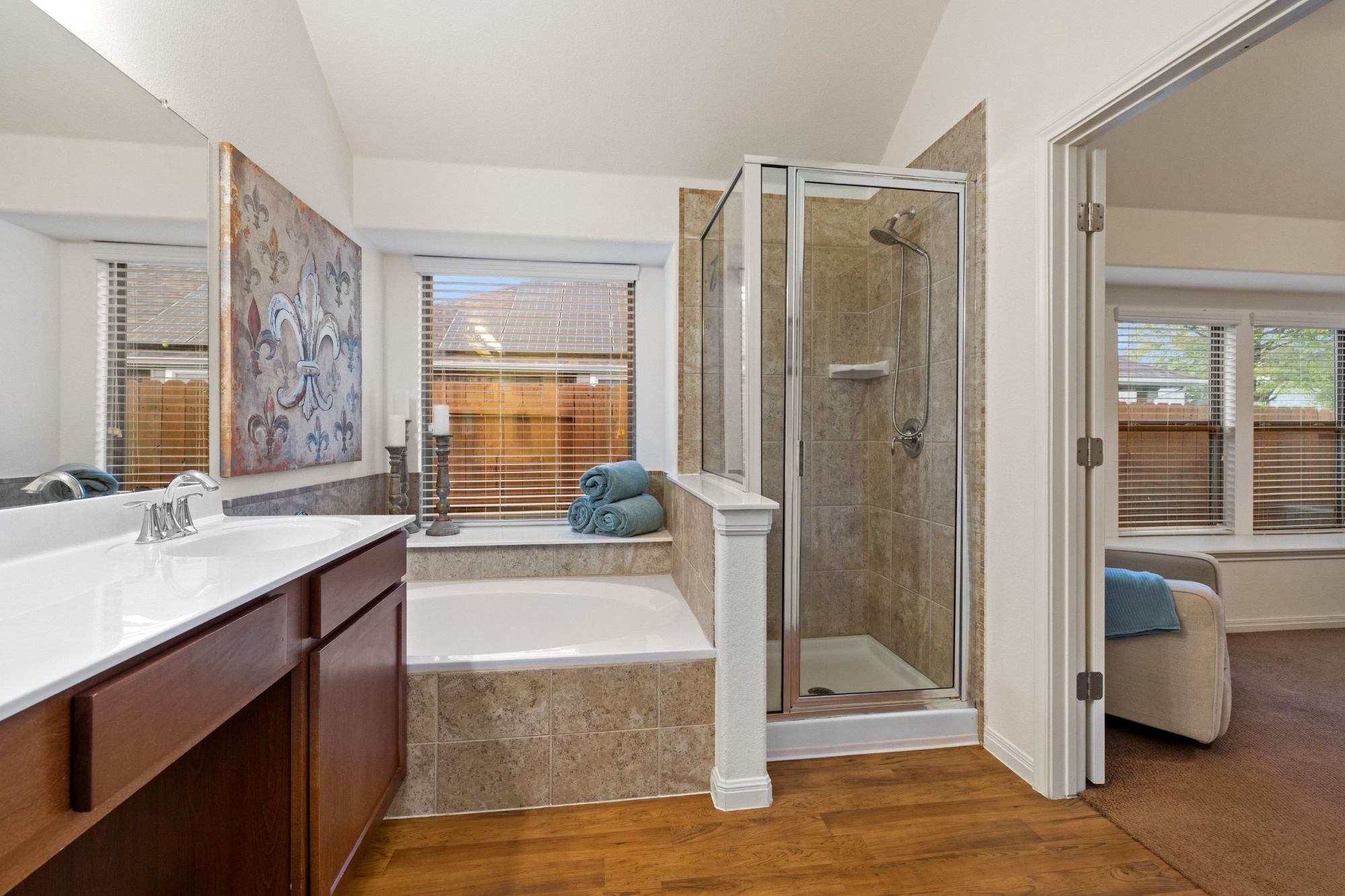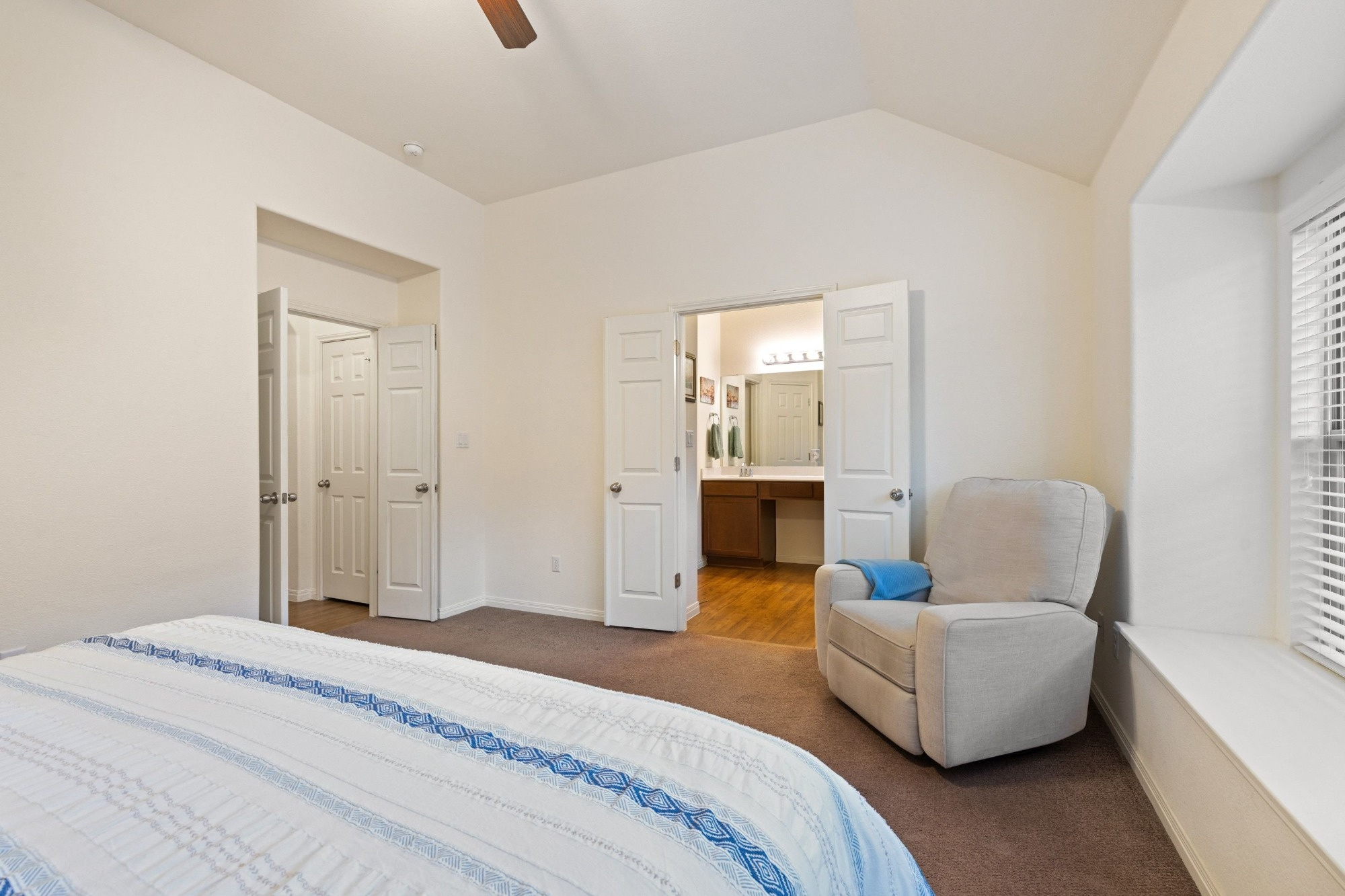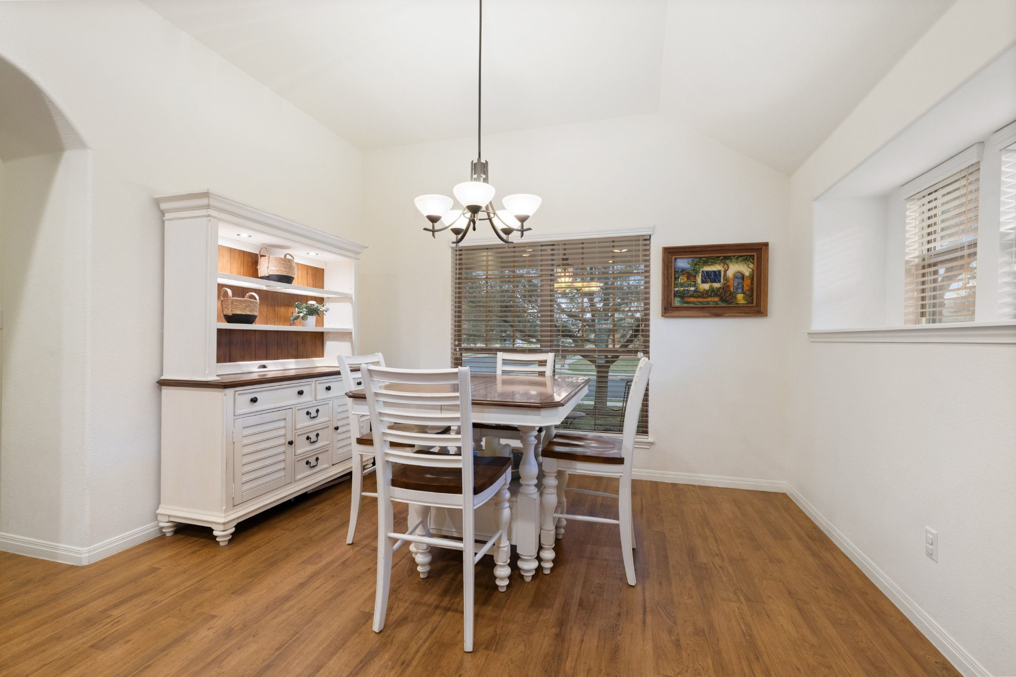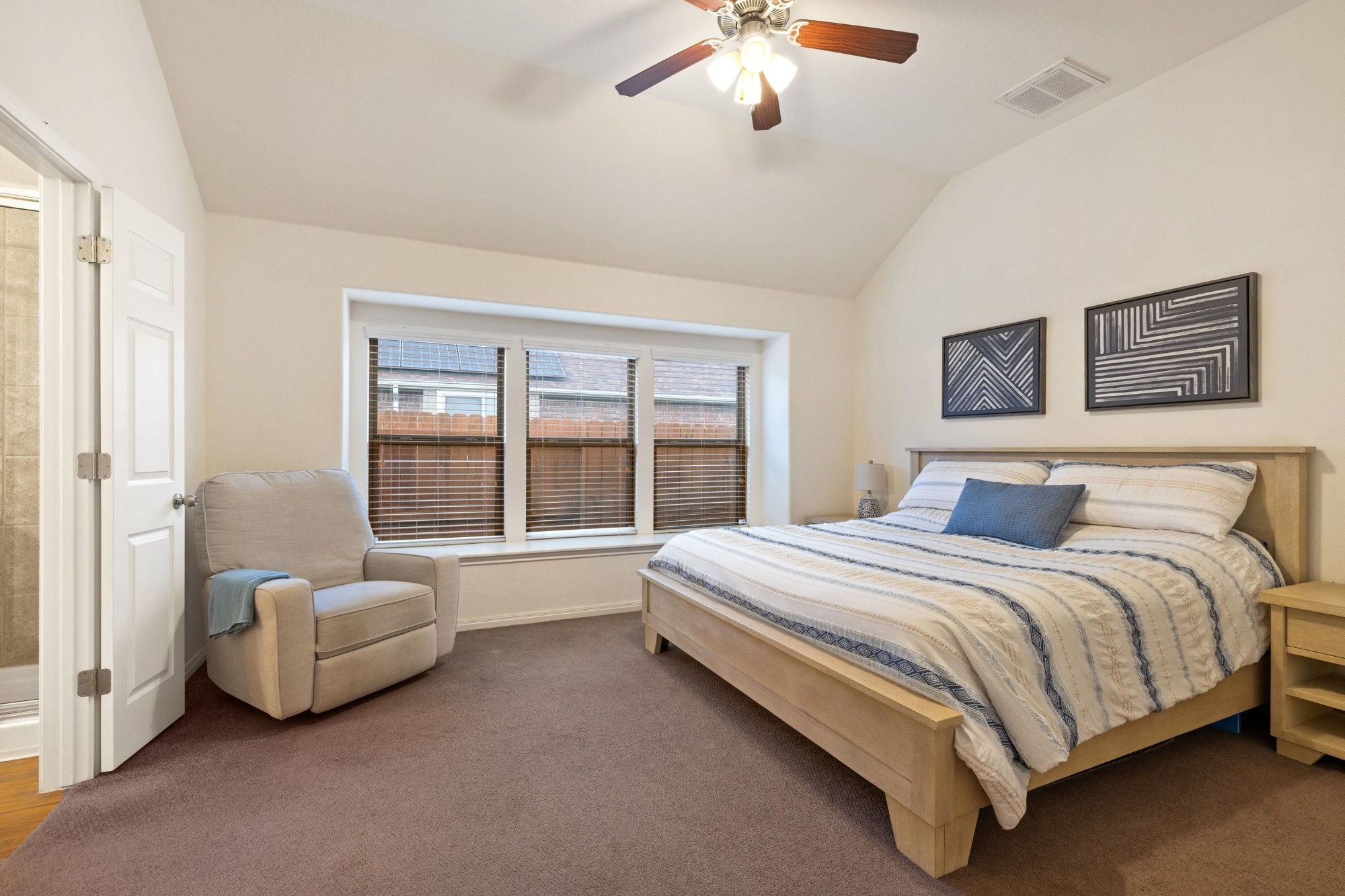 The tranquil primary suite includes a 10-foot vaulted ceiling, window seat, and ensuite bath with double vanity, soaking tub, walk-in shower, private water closet, and walk-in closet. Two generously sized secondary bedrooms with large closets share a full bath at the back of the home. The extra-deep wraparound fenced backyard provides ample space to relax on the porch or patio, with no rear neighbor and peaceful wooded views enhancing privacy.