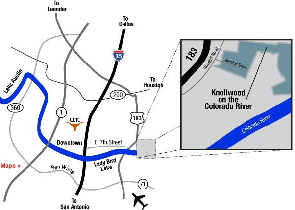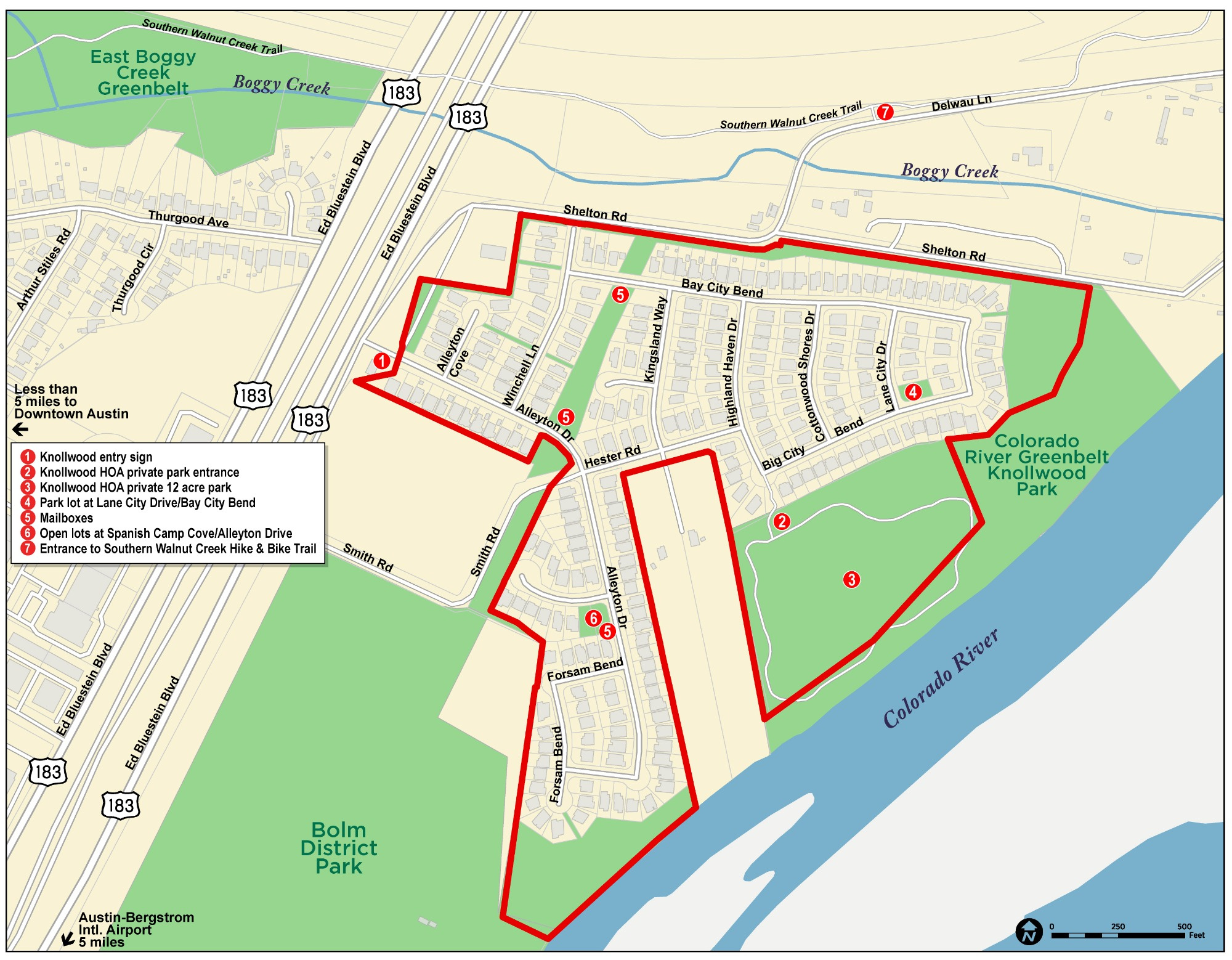 Knollwood on the Colorado River is a 249-home community just east of downtown Austin featuring shaded mailbox clusters, two neighborhood parks, and a private gated 12-acre riverfront park with hike-and-bike trail, picnic area, Adirondack chairs, tree swings, and canoe/kayak launch. Residents also enjoy access to the Walnut Creek hike-and-bike trail connecting to Govalle Park, downtown Austin, the YMCA, and Austin Tennis Center. Convenient to Austin-Bergstrom International Airport, Circuit of the Americas, and the Mueller district for shopping and dining. Annual HOA fee is only $275.